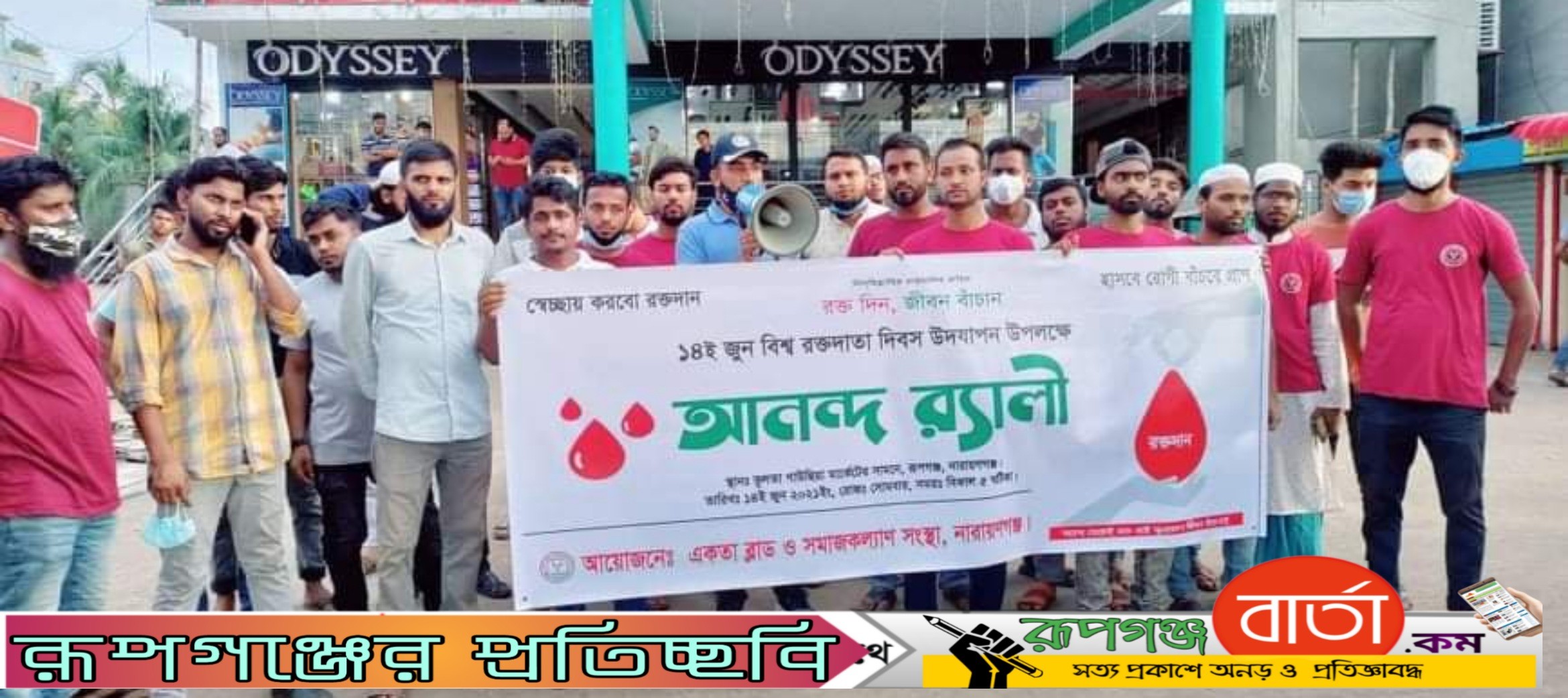 রূপগঞ্জ বার্তা ডেস্কঃ ১৪ ই জুন, বিশ্ব রক্তদাতা দিবস উপলক্ষে নারায়ণগঞ্জ জেলার অন্যতম স্বেচ্ছাসেবী সংগঠন একতা ব্লাড ও সমাজকল্যাণ সংস্থা এর পক্ষ থেকে এক আনন্দ র্যালী আয়োজন করা হয়।