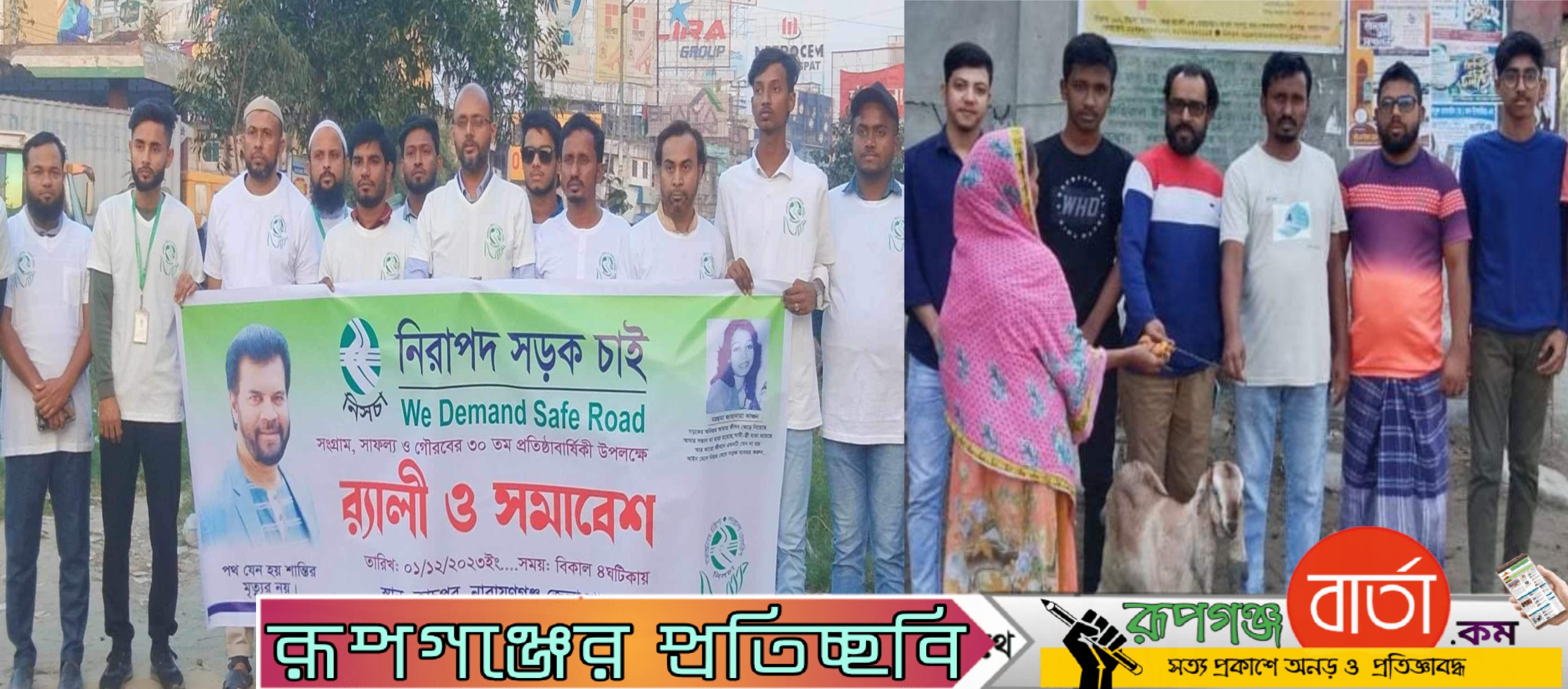 মাহামুদুল হাসান নয়ন: পথ যেনো হয় শান্তির, মৃত্যুর নয় ,এই স্লোগানে নিরাপদ সড়ক চাই জাতীয় সংগঠনের ৩০তম প্রতিষ্ঠাবার্ষিকী উপলক্ষে নারায়ণগঞ্জের রূপগঞ্জের সীমান্তবর্তী কাচঁপুর এালাকায় আলোচনা সভা র্যালী, ও ছাগল বিতরণ করা হয়েছে।