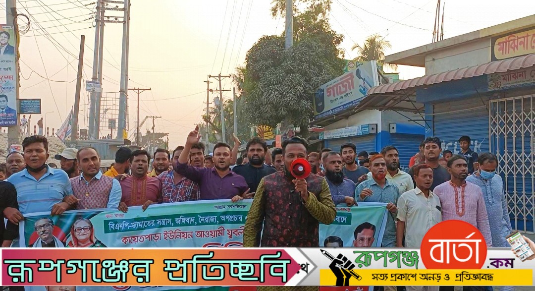 মাহামুদুল হাসান নয়নঃ নারায়নগঞ্জের রূপগঞ্জ উপজেলার কায়েতপাড়ায় বিএনপি জামাতের জঙ্গীবাদ, নৈরাজ্য, অপপ্রচার ও অব্যহত দেশবিরোধী ষড়যন্ত্রের প্রতিবাদে বিক্ষোভ ও প্রতিবাদ সভা অনুষ্ঠিত হয়েছে।