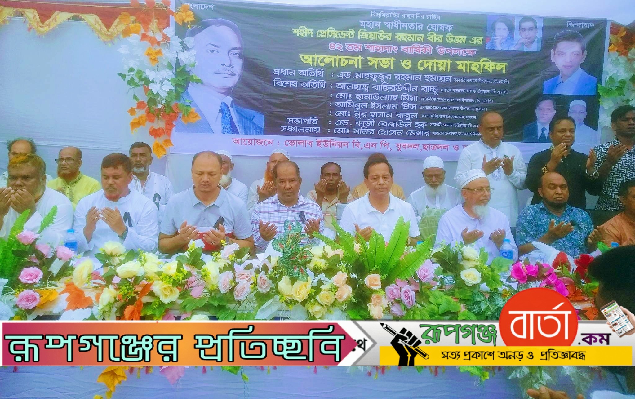 নারায়ণগঞ্জের রূপগঞ্জ উপজেলার ভোলাব ইউনিয়ন বিএনপির উদ্যোগে শহীদ রাষ্ট্রপতি জিয়াউর রহমানের ৪২তম শাহাদাত বার্ষিকী উপলক্ষে দোয়া ও মিলাদ মাহফিল অনুষ্ঠিত হয়েছে। সোমবার (৩ জুন) সকালে উপজেলার ভোলাব ইউনিয়নের সবুজ ছায়া স্কুল মাঠে এই দোয়া মাহফিল অনুষ্ঠিত হয়।