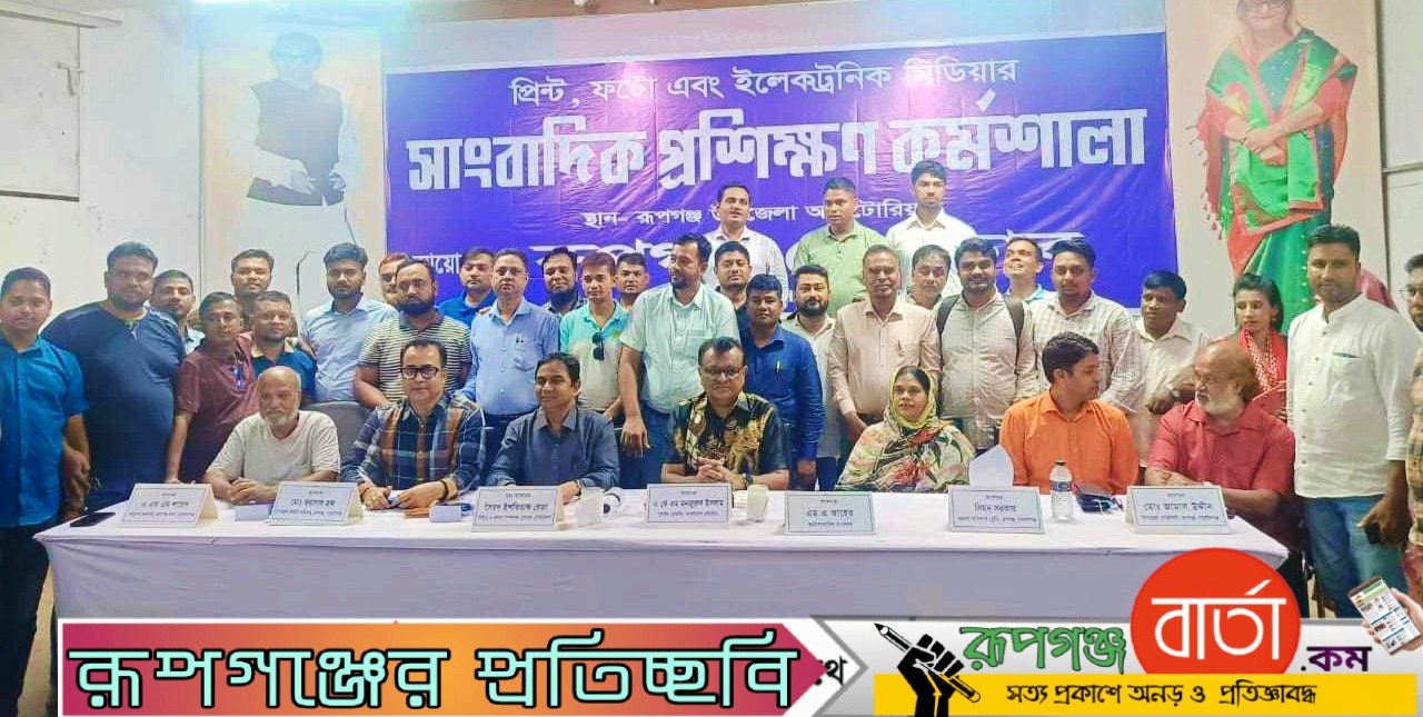 রূপগঞ্জ প্রেসক্লাবের আয়োজনে প্রিন্ট, ফটো এবং ইলেটকট্রনিক্স মিডিয়ার ৭০ জন সাংবাদিকের মাঝে সাংবাদিক প্রশিক্ষণ কর্মশালা অনুষ্ঠিত হয়েছে। বুধবার সকাল ৯ টা থেকে বিকেল ৫ টার পর্যন্ত মুড়াপাড়া এলাকার উপজেলা অডিটোরিয়ামে এ কর্মশালা অনুষ্ঠিত হয়। কর্মশালায় সাংবাদিকদের কারেন্ট নিউজ, স্পেশাল রিপোর্ট, ফিচার রিপোর্ট ও নিউজের বিভিন্ন কৌশল নিয়ে আলোচনা করা হয়। রূপগঞ্জ প্রেসক্লাবের সভাপতি মীর আব্দুল আলীমের সভাপতিত্বে উক্ত কর্মশালায় মূখ্য আলোচক হিসেবে উপস্থিত ছিলেন, গ্লোবাল টেলিভিশনের সিইও এবং প্রধান সম্পাদক ইশতিয়াক রেজা। এছাড়া আলোচক হিসেবে আরও উপস্থিত ছিলেন বাংলাদেশ প্রতিদিনের প্লানিং এডিটর একেএম মঞ্জুরুল ইসলাম, বিশিষ্ট ফটো সংবাংদিক ও লেখক এমএ তাহের। এসময় আরও উপস্থিত ছিলেন, উপজেলা নির্বহী অফিসার ফয়সাল হক, সহকারী কমিশনার (ভূমি) সিমন সরকার, রূপগঞ্জ থানার ভারপ্রাপ্ত কর্মকর্তা (ওসি) এএফএম সায়েদ, উপজেলা প্রকৌশলী জামাল উদ্দিন, গ্যাজেটভুক্ত সমাজসেবক লায়ন মোজাম্মেল হক ভুইয়া, কায়েতপাড়া ইউনিয়নের সাবেক চেয়ারম্যান নুরুজ্জামান খাঁন প্রমূখ। দিনব্যাপী কর্মশালায় রূপগঞ্জ প্রেসক্লাবের প্রিন্ট, ফটো এবং ইলেকট্রনিক্স মিডিয়ার ৭০ জন সাংবাদিক অংশ নেয়।