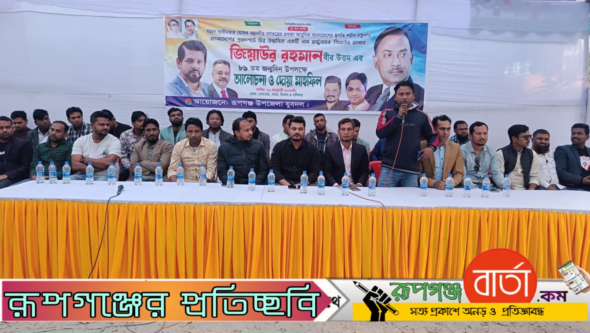 রূপগঞ্জ (নারায়ণগঞ্জ) প্রতিনিধি ঃ শহীদ রাষ্ট্রপতি জিয়াউর রহমানের ৮৯ তম জন্মবার্ষিকী উপলক্ষে নারায়ণগঞ্জের রূপগঞ্জে দোয়া মাহফিল ও আলোচনা সভা করেছে রূপগঞ্জ উপজেলা যুবদলের নেতাকর্মীরা। সোমবার (২০ জানুয়ারি) উপজেলার গোলাকান্দাইল ইউনিয়নের সাওঘাট ছুঙ্গিরপার এলাকায় এ দোয়া মাহফিল ও আলোচনা সভা করা হয়।