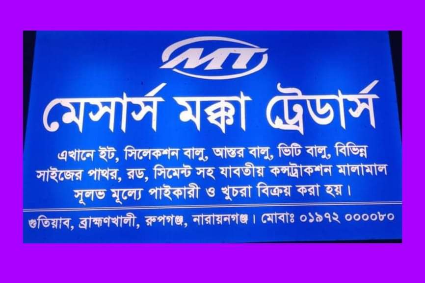 রূপগঞ্জ বার্তা ডেস্কঃ নারায়ণগঞ্জের রূপগঞ্জের ৩০০ফিট আনন্দ পুলিশ হাউজিং সোসাইটির পাশে, পূর্বাচল ৩ নং সেক্টরে আগামী রবিবার ৫-ই সেপ্টেম্বর বিকাল ৪টায় শুভ উদ্বোধন হতে যাচ্ছে মেসার্স মক্কা ট্রেডার্স।