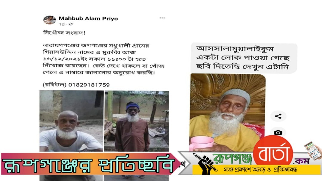 পরে স্থানীয় সাংবাদিকদের ফেসবুক আইডিতে পোস্ট করার ২৪ ঘটার মধ্যে খোঁজ পায় ওই বৃদ্ধের। শুধু তাই নয়, ওই পোস্টকারী সাংবাদিক ও নিঁখোজের পরিবার মিলে ১৭ তারিখ রাতে সুস্থাবস্থায় উদ্ধার করেন। ঘটনাটি ঘটেছে নারায়ণগঞ্জের রূপগঞ্জের মধুখালীতে। বৃদ্ধ গিয়াসউদ্দিনের নাতনী জামাতা রবিউল ইসলাম জানান, গত (১৬ ডিসেম্বর) সকালে তার নানা শশুর স্থানীয় ভক্তবাড়ি বাজারে চা পান করতে যান।
