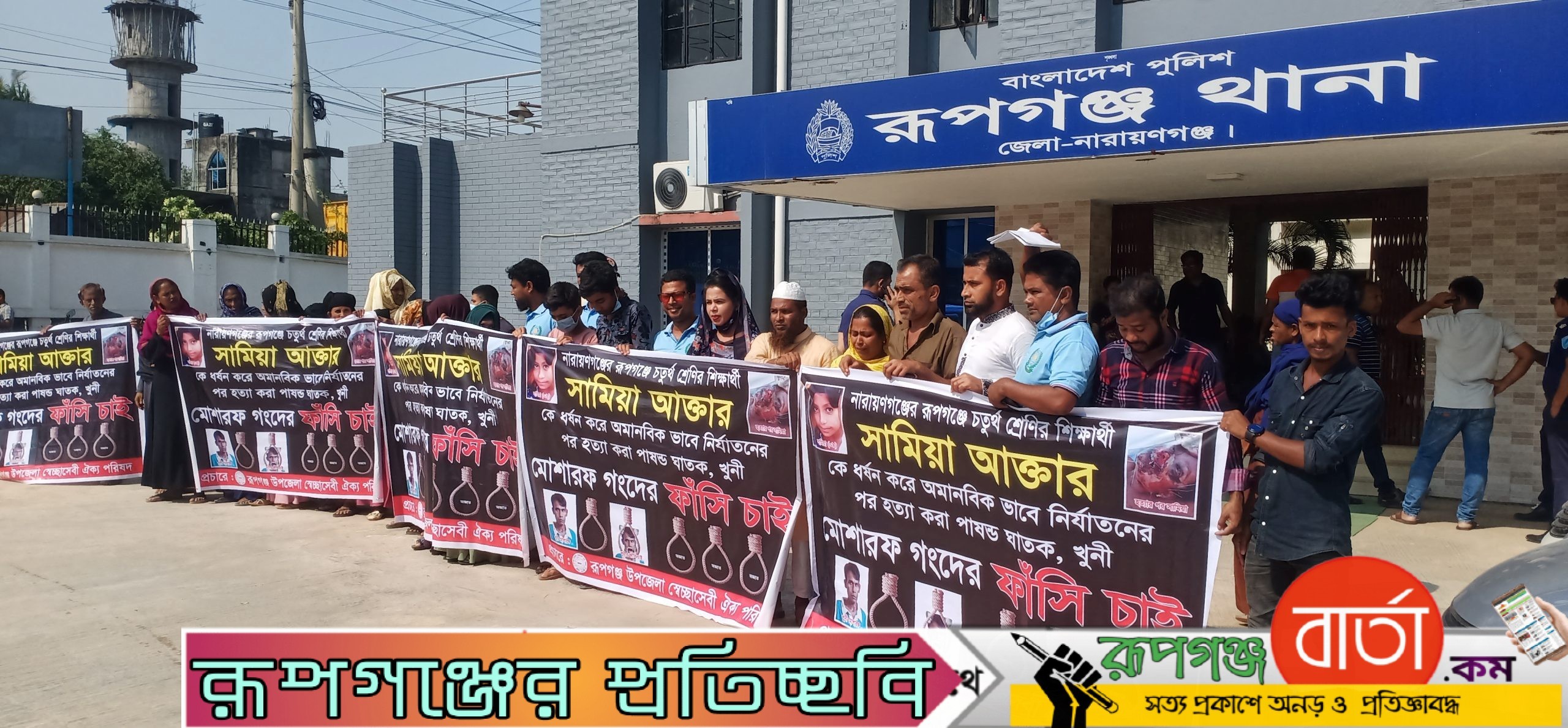 রূপগঞ্জ নারায়ণগঞ্জ প্রতিনিধি ঃ নারায়ণগঞ্জের রূপগঞ্জে চতুর্থ শ্রেণির শিক্ষার্থী সামিয়া(৯)কে অপহরনের পর ধর্ষন করে হত্যা করেছে এক পাষণ্ড ঘাতক খুনি মোশারফের ফাঁসি কার্যকর করার দাবিতে মানববন্ধন করেছে রূপগঞ্জ উপজেলা স্বেচ্ছাসেবী সংগঠনের নেতৃবৃন্দ।