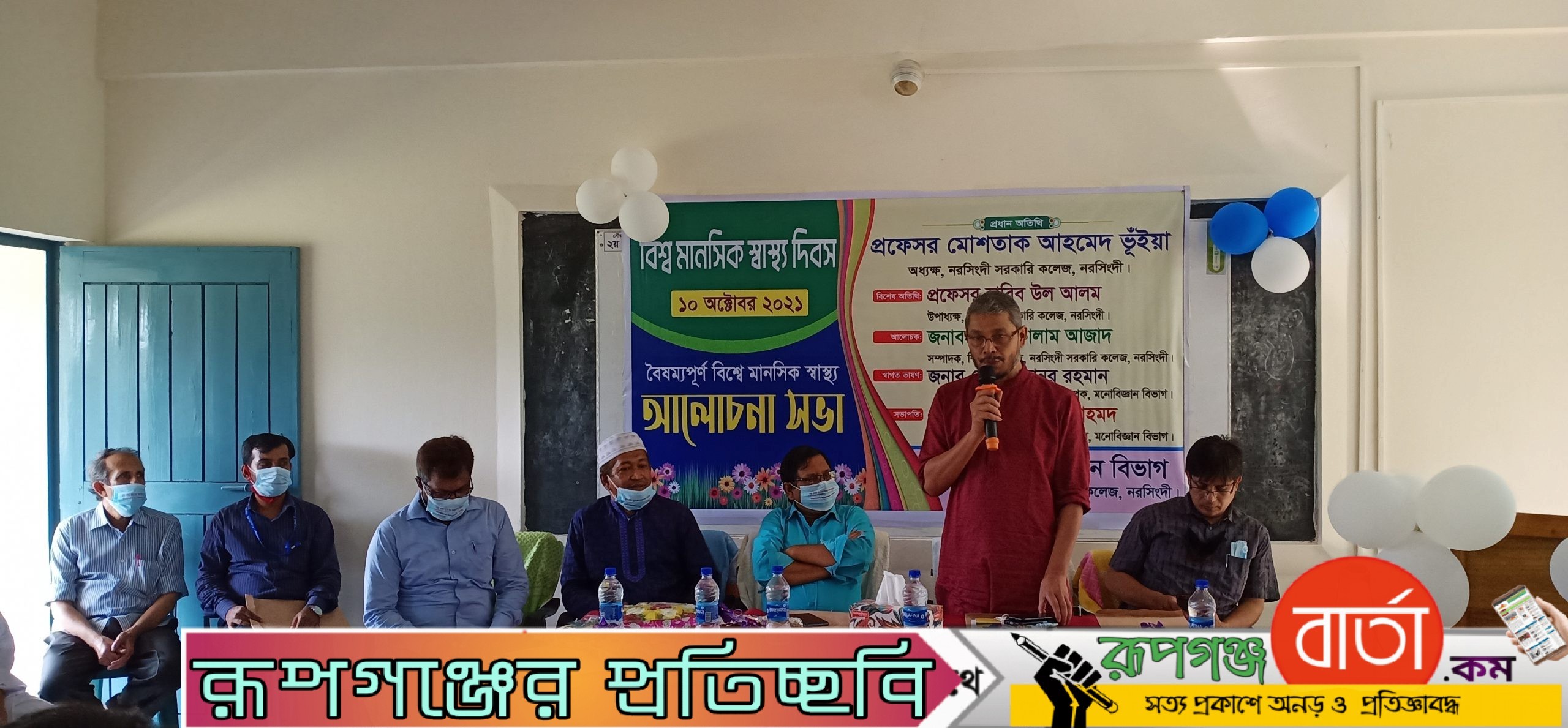 খোরশেদ আলম ঃঃ "বৈষম্যপূর্ণ বিশ্বে মানসিক স্বাস্থ্য"স্লোগানকে প্রতিপাদ্য করে বিশ্ব মানসিক স্বাস্থ্য দিবস উপলক্ষে নরসিংদী সরকারি কলেজ মনোবিজ্ঞান বিভাগের উদ্যোগে র্্যালি , মনোবৈজ্ঞানিক প্রদর্শনী ,চিএ প্রদর্শন ও আলোচনা সভা অনুষ্ঠিত হয়েছে।নরসিংদী সরকারি কলেজ মনোবিজ্ঞান বিভাগের বিভাগীয় প্রধান নাজির আহমেদ এর সভাপতিত্বে ও সাংবাদিক খোরশেদ আলম এর সঞ্চালনায় ১০, অক্টোবর রবিবার সকালে নরসিংদী সরকারি কলেজের মনোবিজ্ঞান বিভাগে এ র্্যালি, মনোবৈজ্ঞানিক প্রদর্শনী ,চিএ প্রদর্শন ও আলোচনা সভা অনুষ্ঠিত হয়। এ সময় মনোবিজ্ঞানের শিক্ষার্থীরা বিভিন্ন মনোবৈজ্ঞানিক প্রদর্শনী প্রদর্শন করে। এবং পরীক্ষনের ফলাফল উপস্থাপন করেন।এ সময় প্রধান অতিথি হিসেবে উপস্থিত ছিলেন নরসিংদী সরকারি কলেজের অধ্যক্ষ প্রফেসর মােশতাক আহমেদ ভূঁইয়া,বিশেষ অতিথি হিসেবে উপস্থিত ছিলেন-নরসিংদী সরকারি কলেজের উপাধ্যক্ষ প্রফেসর হাবিব উল আলম,স্বাগত বক্তব্য প্রদান করেন মনােবিজ্ঞান বিভাগের সহকারি অধ্যাপক মােঃ মিজানুর রহমান, আলোচক হিসেবে উপস্থিত ছিলেন নরসিংদী সরকারি কলেজ, শিক্ষক পরিষদের সম্পাদক আবুল কালাম আজাদ সহ মনোবিজ্ঞান বিভাগের সকল বর্ষের ছাত্র ছাত্রী বৃন্দ উপস্থিত ছিলেন।, এ সময় আলোচনা সভায় বক্তারা বলেন-আজ ১০ অক্টোবর বিশ্ব মানসিক স্বাস্থ্য দিবস।নভেল করোনাভাইরাস (কোভিড-১৯) মহামারীর প্রভাবে বিশ্বের অন্যান্য দেশের মতো বাংলাদেশেও মানসিক স্বাস্থ্য সমস্যা বেড়েছে। যারা কোভিড-১৯ আক্রান্ত হয়েছেন তারাই নয় বরং যারা এখনো এই রোগে আক্রান্ত হননি তাদের মাঝেও বাড়ছে মানসিক নানা সমস্যা। একইসঙ্গে যারা কোভিড-১৯ সংক্রমণ থেকে সুস্থ হয়ে উঠেছেন তাদের মাঝেও দেখা দিচ্ছে নানা রকম মানসিক স্বাস্থ্য সমস্যার প্রভাব। এর ফলে সামাজিকভাবেও দেখা যাচ্ছে নানা রকমের বিশৃঙ্খলা। আর এমন এক পরিস্থিতিতে বিশ্বব্যাপী এবার পালিত হচ্ছে মানসিক স্বাস্থ্য দিবস। এ সময় বক্তারা আরো বলেন শারীরিক স্বাস্থ্যের পাশাপাশি মানসিক স্বাস্থ্য অত্যন্ত গুরুত্বপূর্ণ।এসময় মানসিক স্বাস্থ্যের বিভিন্ন গুরুত্বপূর্ণ দিক তুলে ধরেন এবং সকলের মানসিক সুস্বাস্থ্য কামনা করেন।